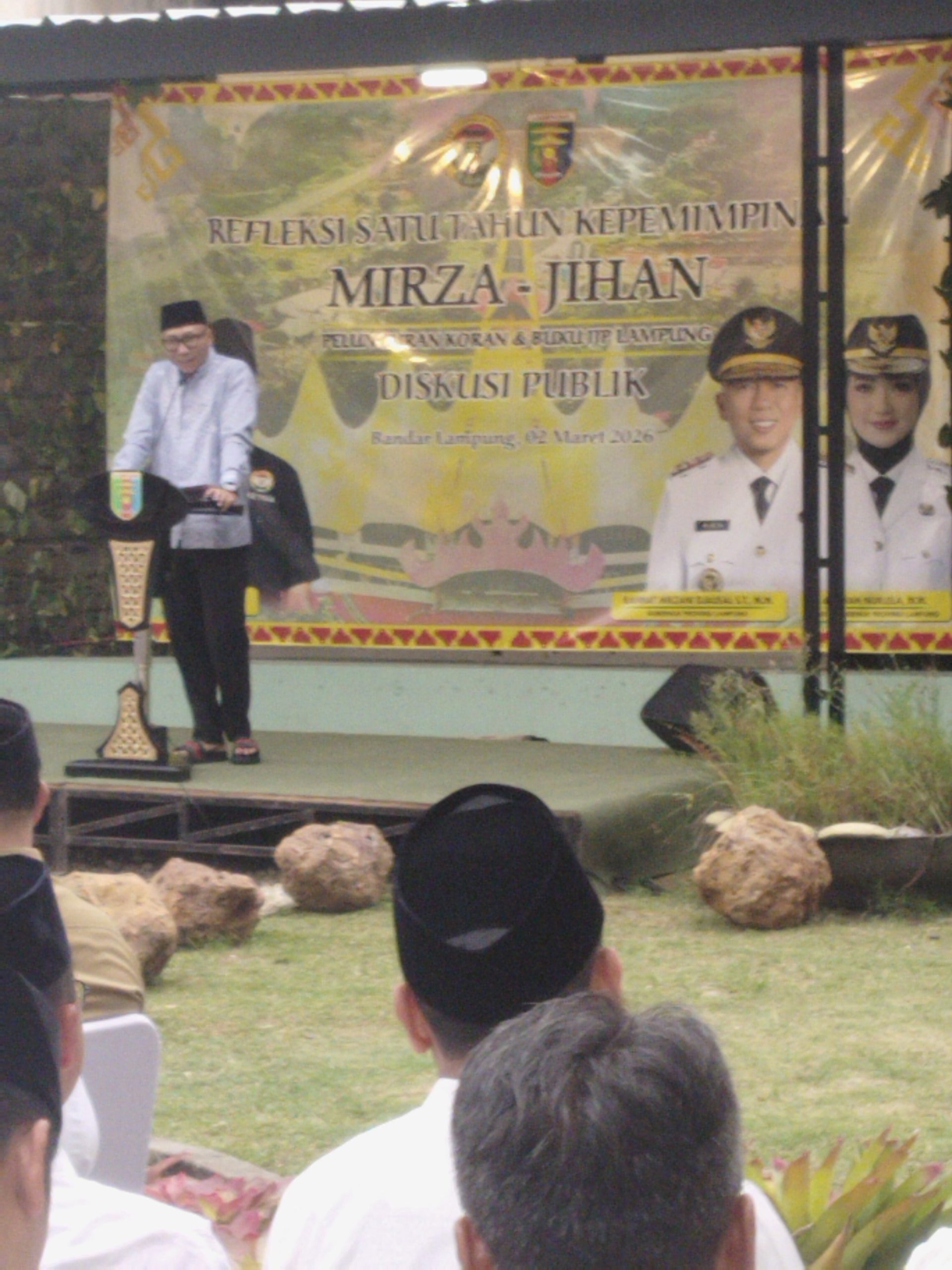 Hal tersebut disampaikan saat Peluncuran Koran Ikatan Jurnalis Provinsi (IJP) Lampung serta peluncuran buku 1 Tahun Mirza – Jihan yang dirangkaikan dengan Diskusi Publik Refleksi 1 Tahun Kepemimpinan Pemerintah Provinsi Lampung di Taman Outdoor Gedung Pusiban, Senin (2/3/2026).